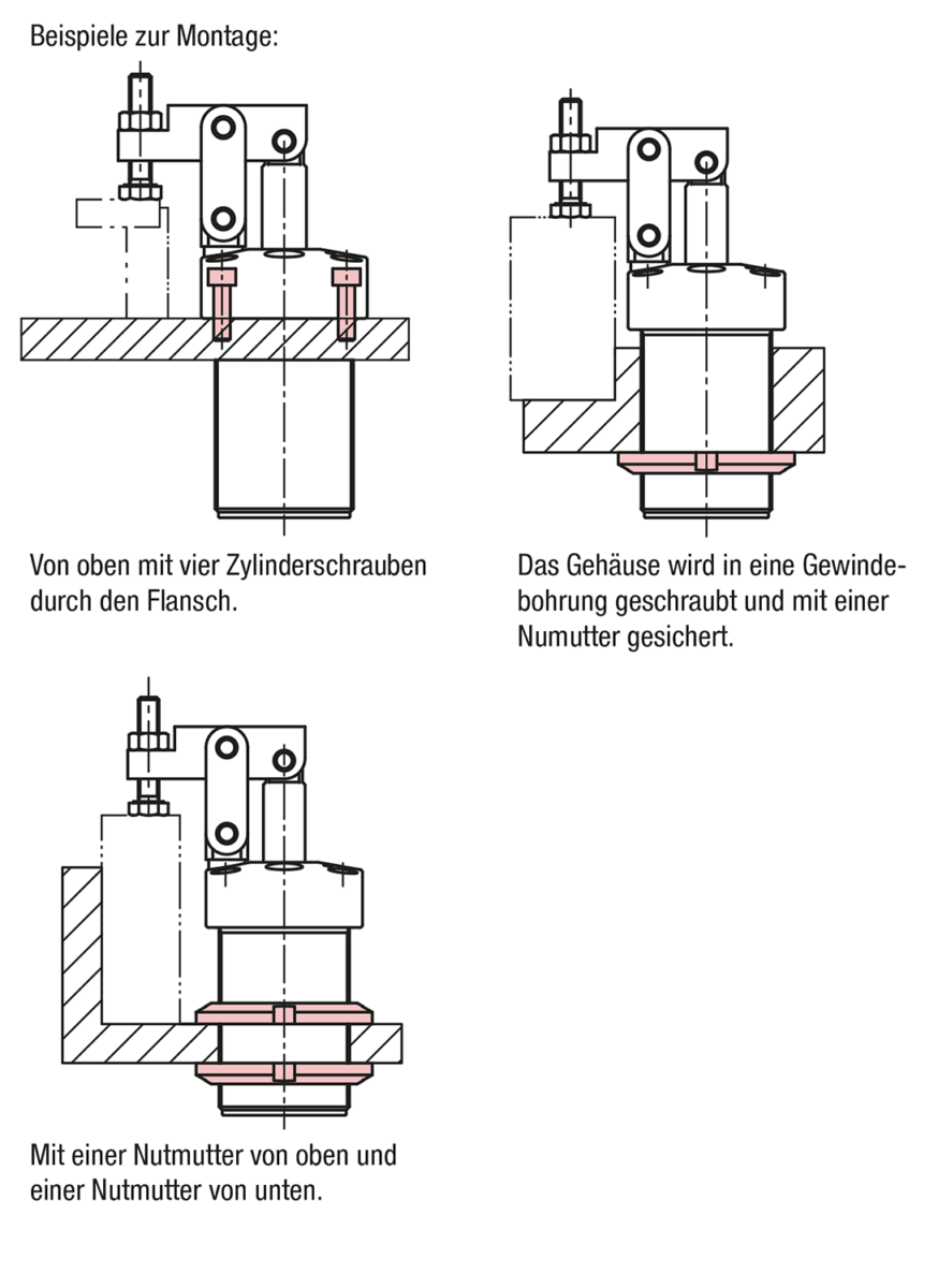 Der einschraubbare Hebelspanner mit Flansch kann mit Hilfe einer Nutmutter nach DIN 70852 von oben oder von unten befestigt werden. Eine weitere Möglichkeit wäre, den Hebelspanner mit vier Zylinderschrauben von oben an der Vorrichtung zu befestigen.