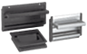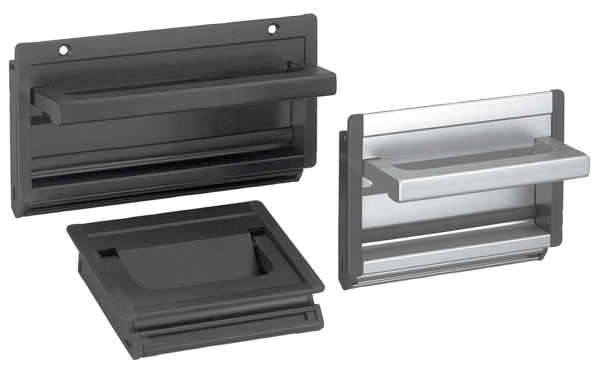 Griffschale und Klappgriff aus Aluminiumprofil. Abschlusskappen Polyamid. Form A Befestigung durch Gummiprofil. Form B Befestigung durch 2 Senkschrauben, Stahl.