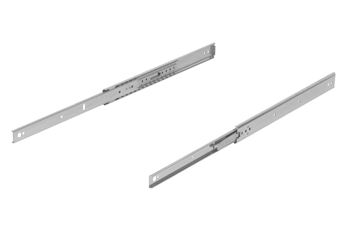 Bei Teleskopschienen mit Teilauszug ist der Hub kleiner als die Einbaulänge. Rastung in geöffneter Position. Durch das Betätigen des Entriegelungshebels kann der Schubkasten problemlos herausgenommen und von der Führung getrennt werden.